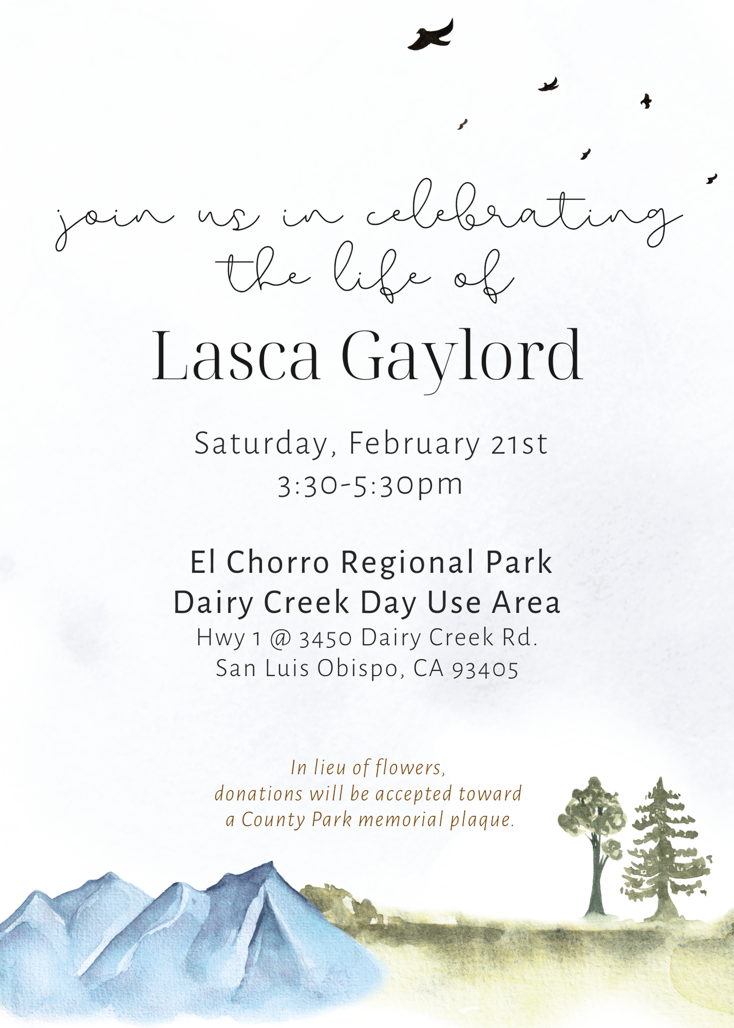 The Landscape Architecture Department is sad to announce that alumna Lasca Gaylord passed away on Feb 2, 2026. Lasca graduated from Cal Poly Cum Laude in 2010 and went on to work as a Supervising Park Ranger with the San Luis Obispo County Parks & Recreation Department. Her bright smile and warm and loving presence while in the program are remembered fondly by the faculty and staff who had the pleasure of knowing her. Read Lasca's obituary.